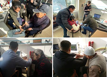 這次活動,志愿者不但帶來了水果,而且?guī)砹丝七M-澳思泰公司自主研發(fā)的超聲骨密度儀,為老人們測量骨密度。